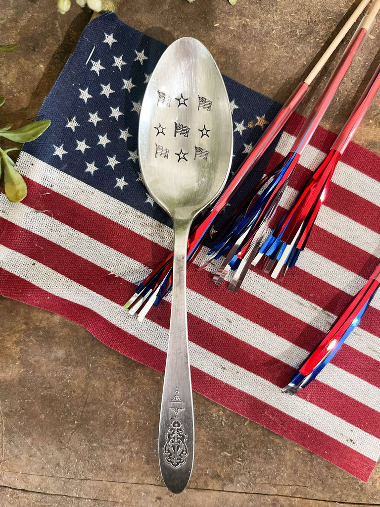 Hand stamped “flags and stars” spoon. This is for ONE spoon.