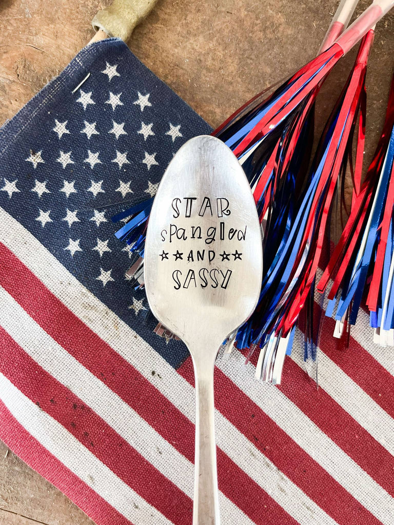 Hand stamped “star spangled & sassy” spoon with stars. This is for ONE spoon.