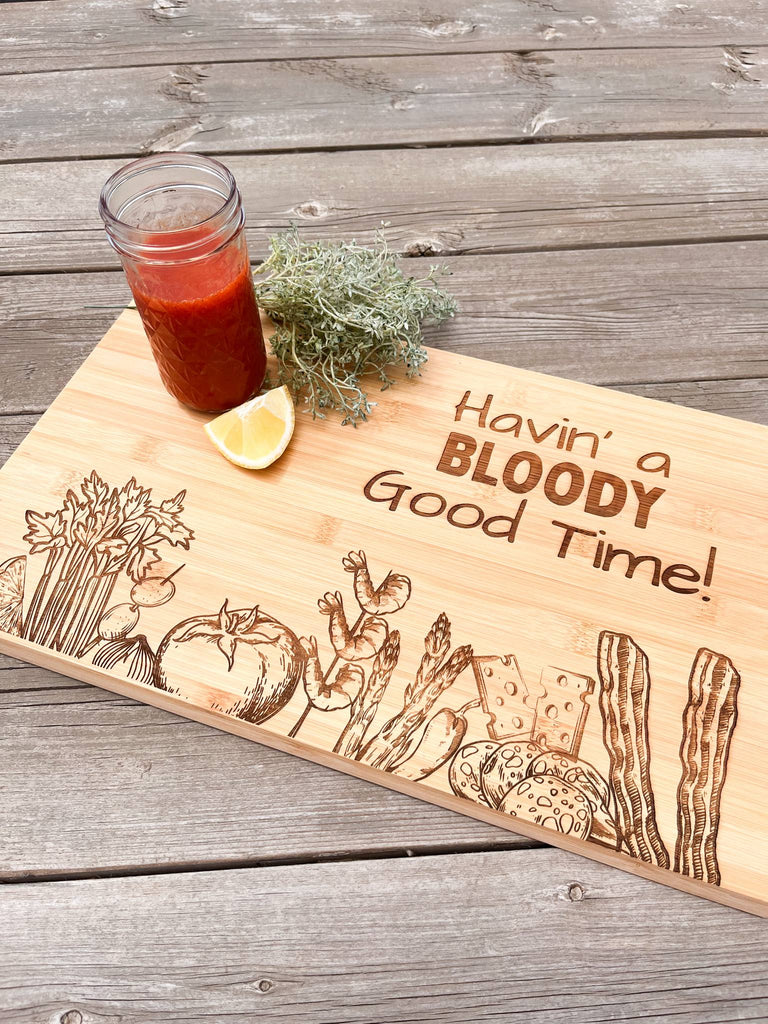 Bloody Mary Board. This is perfect for summertime! This is a 17x11 bamboo serving board. We recommend hand washing only and using mineral oil for the longevity of the board. These are 100% food safe!