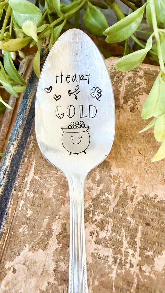 Heart of Gold stamped spoon with a pot of gold and hearts! Perfect for St. Patrick's Day!