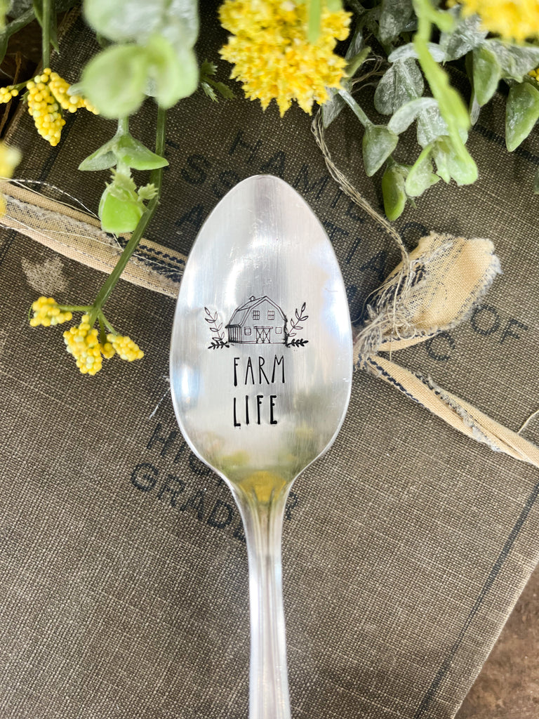 Hand stamped “farm life” spoon with a barn and greenery. This is for ONE spoon.