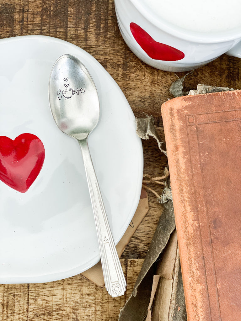 Hand stamped “love” with a cup and hearts replacing the “o”. This is for ONE spoon!